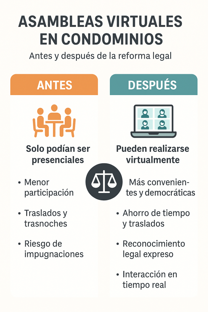 Aunque en la práctica muchos condominios ya realizaban asambleas por medios virtuales, ahora la ley lo respalda de forma explícita, brindando seguridad jurídica y certeza a los acuerdos que se tomen bajo esta modalidad.